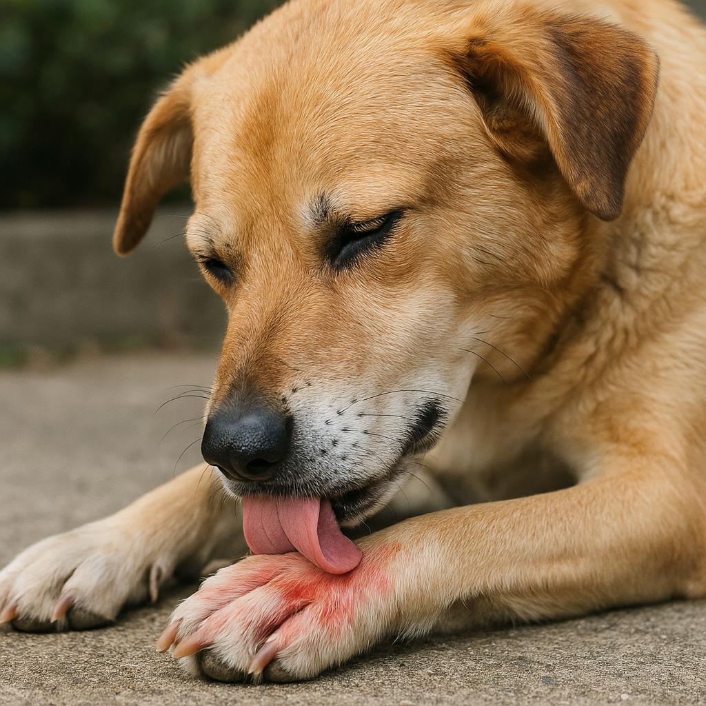 Dette er ikke en dårlig vane eller kjedsomhet. Det er et tydelig tegn på dyp, allergisk kløe som kommer innenfra. Den rødbrune fargen er beviset – det kommer fra enzymer i hundens spytt, som reagerer med luften.